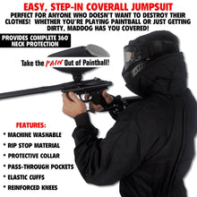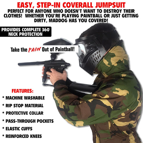 Perfect for anyone who doesn't want to destroy their clothes! Maddog's one piece, machine washable, step-in coverall jumpsuit makes it easy! Button closure w/ elastic wrist cuffs, built-in protective collar, heavy duty rip stop material, reinforced knees, & pass-through pockets. Whether you're playing paintball or just getting dirty, Maddog has you covered!
